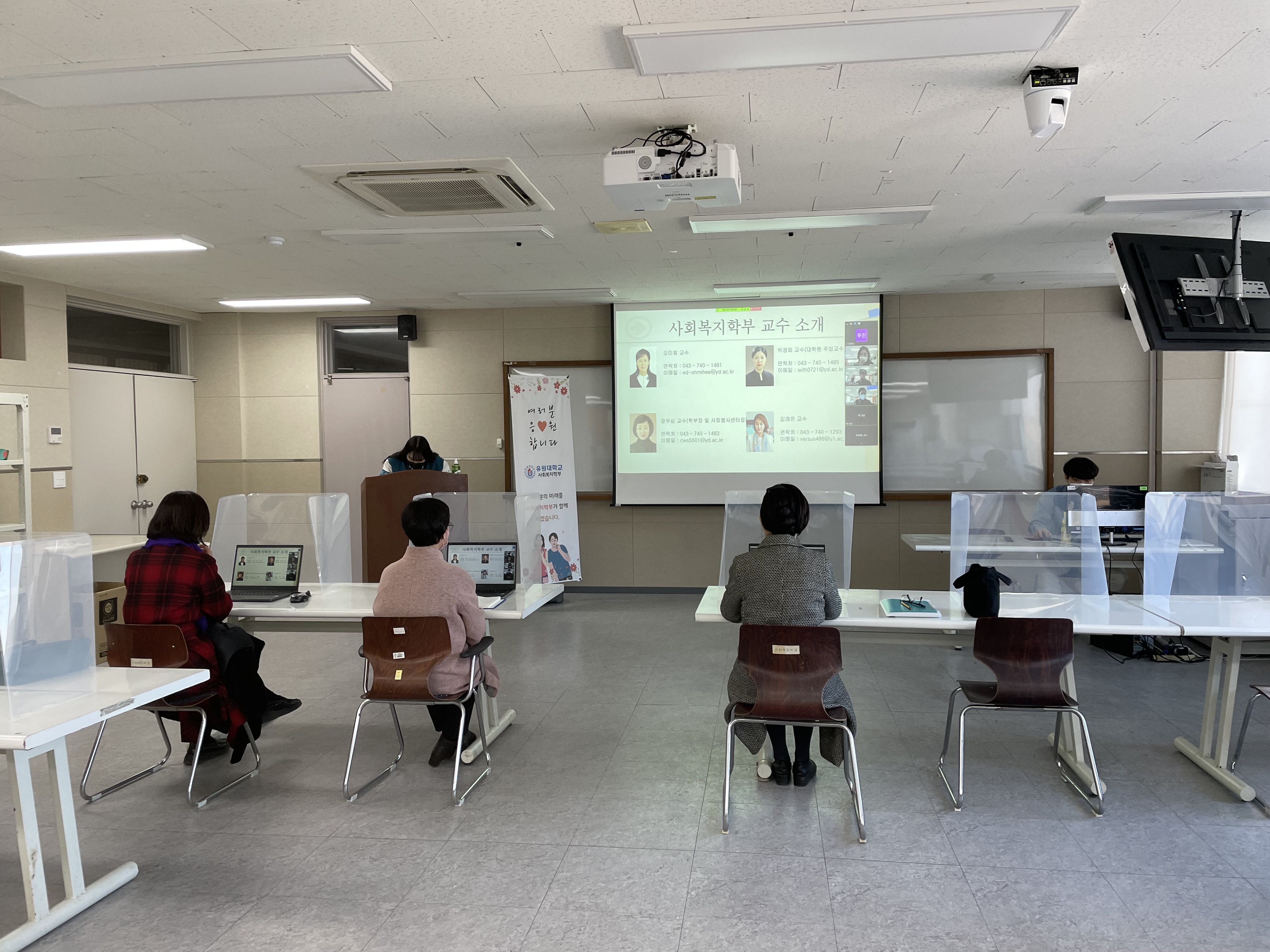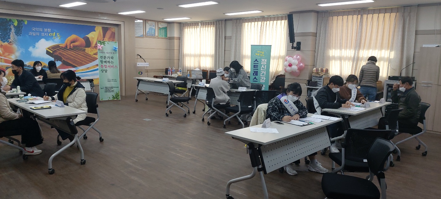 - 참여자: 오미희 교수님, 허 욱(4학년), 정수연(3학년), 최은지(3학년) - 주관: 영동군지역사회보장협의체 - 협력기관: 유원대학교 사회복지학부, 장애인복지관, 교육지원청, WEE센터 등 - 기간: 12월 6일(월) 15시 30분~16시 30분까지 : 영동읍사무소 2층 소회의실에서 '위드코로나 영동군민 마음건강 챙기기' 통합 서비스 상담을 진행하였습니다. 스트레스, 우울증, 코로나블루, 65세 이상 어르신 일상생활 체크리스트를 통해 전문가 및 사회복지학부 오미의 교수님, 재학생들과 함께 대화를 나누며 공감과 위로를 전할 수 있는 뜻깊은 활동이였습니다. - 주관: 영동군지역사회보장협의체